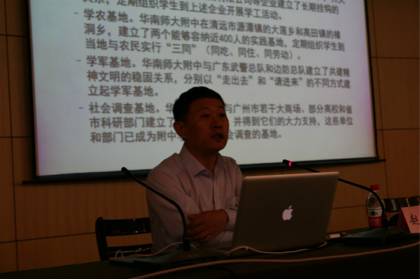 报告会上,赵建华教授以杜郎口中学和华南师大附属中学两个学校为例,阐述其特殊性并引导与会者反思其特有的教学模式带来的效果和意义。接着赵建华教授展示了其正在思考的如教育的目的、布鲁姆的目标分类、行为主义学习、皮亚杰的认知发展理论和加涅的信息加工理论等十二个问题。然后介绍了知识存在的四种状态:情境性知识、多样性知识、结构化知识和社会性知识。并在此基础上系统的介绍了各种学习理论,就能力发展和学业成就进行了论述。