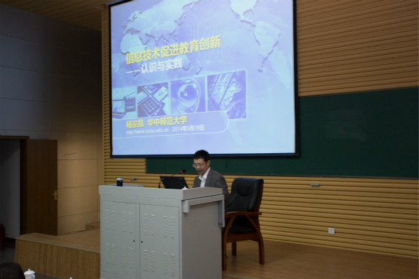 9月18日,应太阳成tyc7111cc邀请,华中师范大学校长、博士生导师杨宗凯教授来我校作了题为《信息技术促进教育创新——认识与实践》的学术报告。报告会由我校副校长董晨钟教授主持,我校副校长田澍教授、各学院党政负责人、机关各相关部门负责人、太阳成集团tyc7111cc主页全体教师、硕士研究生共计300余人参加了报告会。