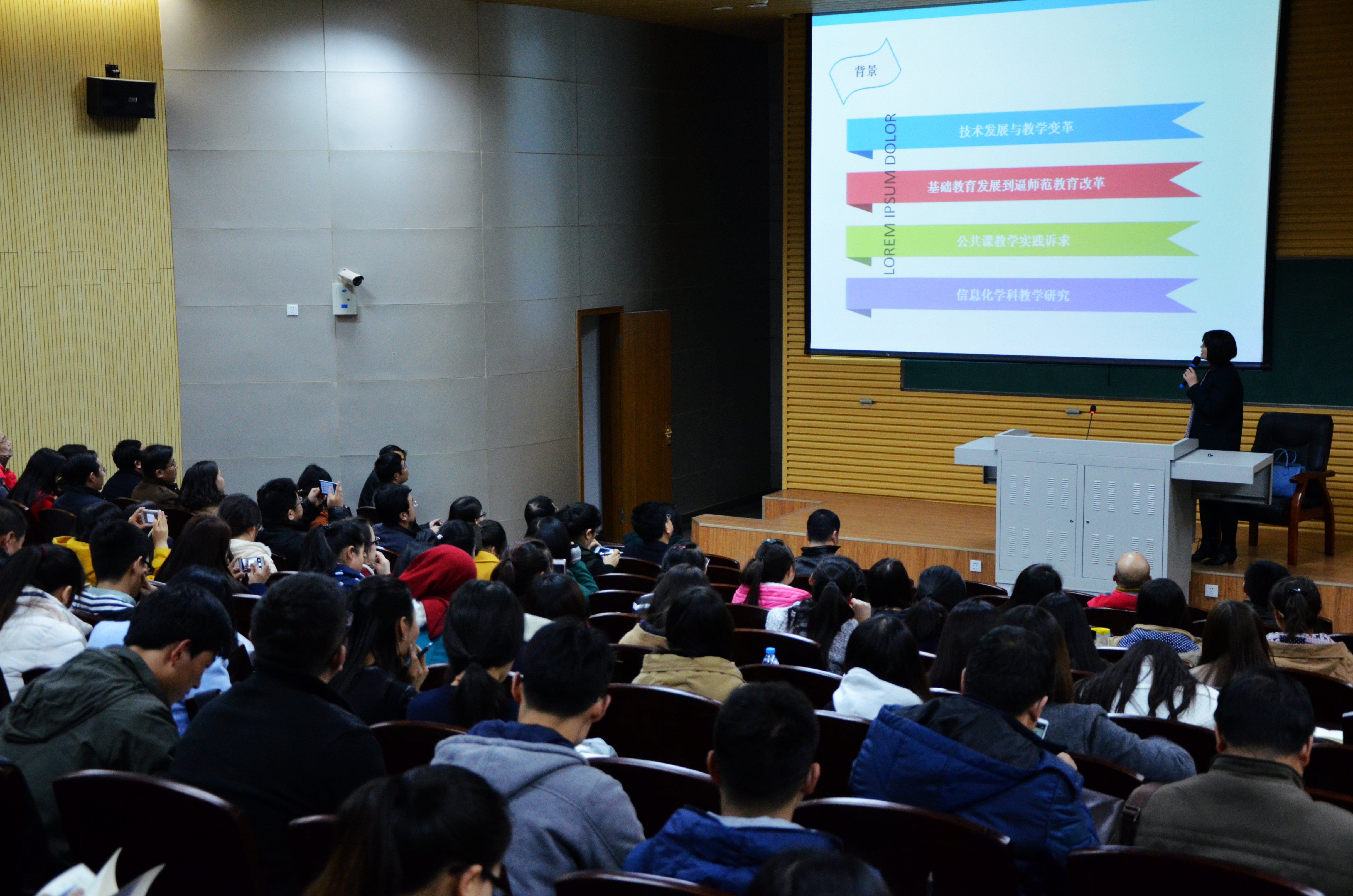 2016年3月10日下午,我院“首届信息化教育学术论坛”第九讲主讲人张筱兰教授和董晓辉博士分别作了题为“构建信息化学科教学论的思考”和“语义网教育应用”的报告。学院全体教师、研究生及部分本科生300余人参加了学术论坛。