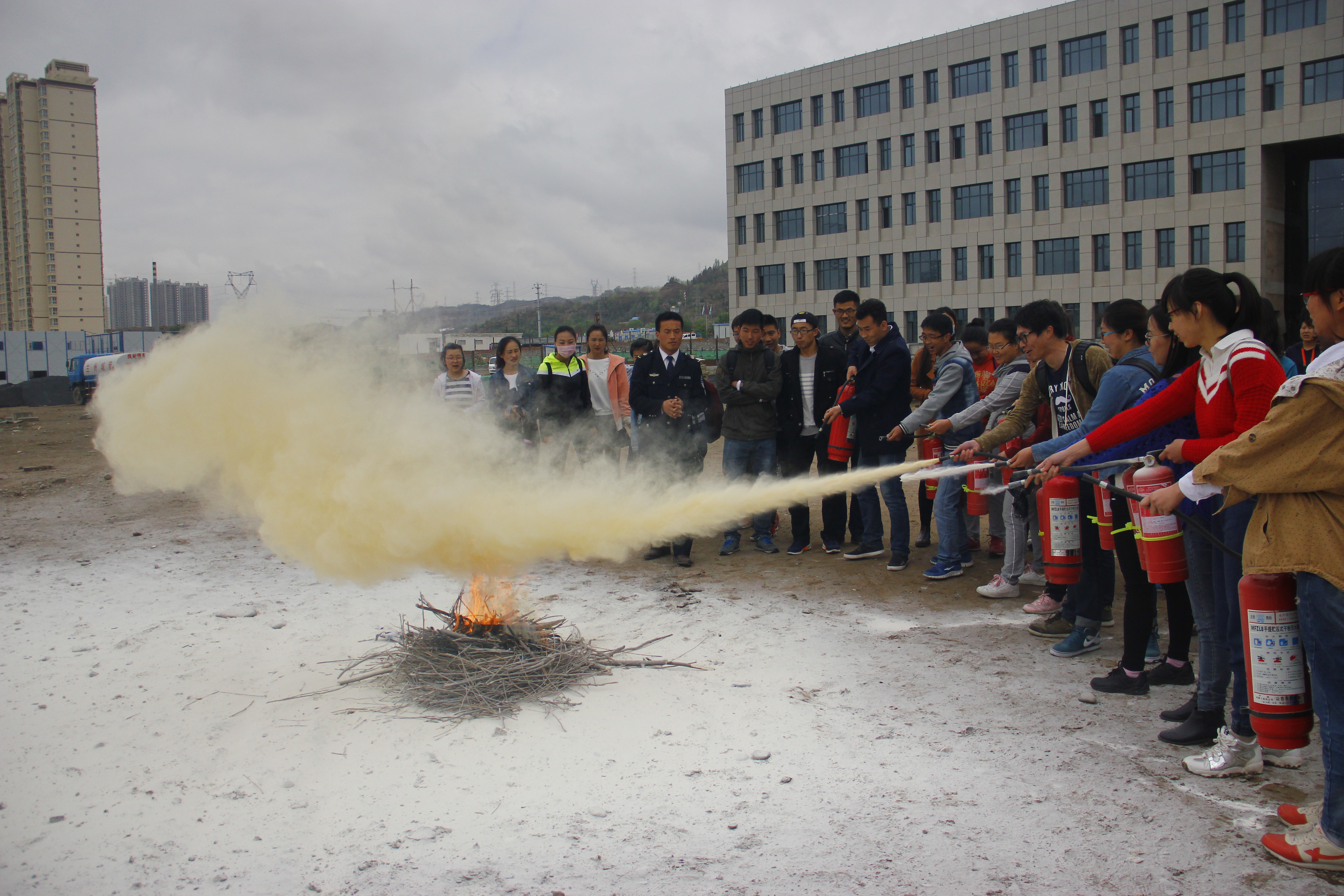 会后,任升宽警官带领师生在户外进行灭火演练,模拟火灾现场,并对灭火过程中出现的一些问题进行了指导。