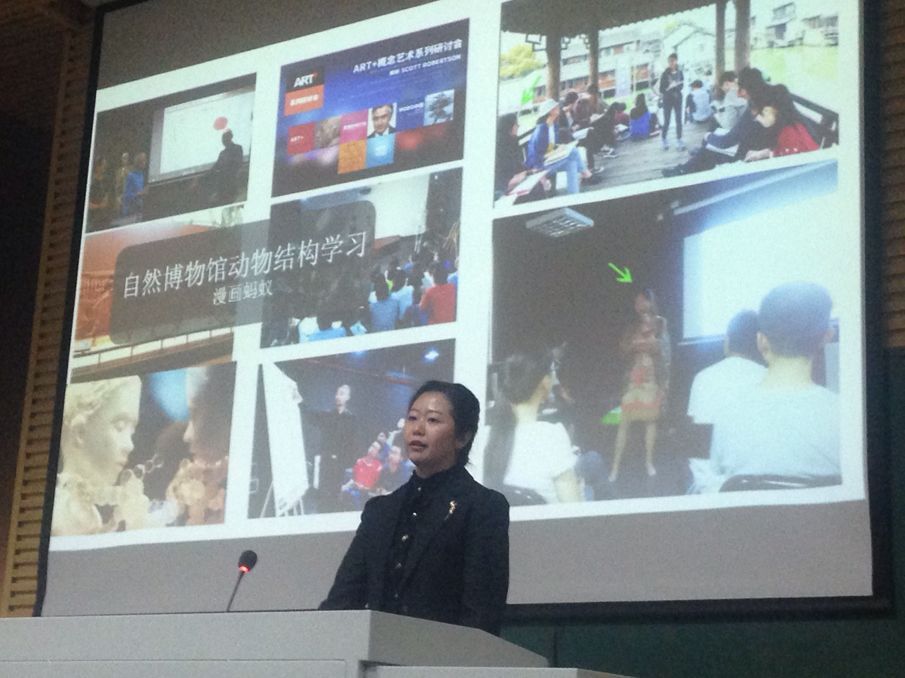 张尧老师汇报了自己在art+(上海阿忒加文化发展有限公司)进修学习的经历和感悟,展示了在自然博物馆动物结构学习、乌镇写真等方面的学习过程与作品。提出了学生的职业核心工作能力包括信息获取方式、认知方式、管理方式与行为模式。对于如何培养学生的职业核心工作能力,概括了多任务项目化的行动教学法,包括对学生价值的构建、启发、资源与规划、实施与评估等几个阶段。