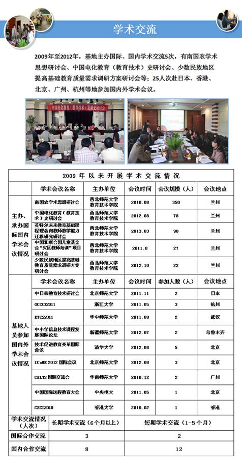 通过选派研究人员国内外访学、参加各类学术会议,邀请国内外本领域高水平专家来中心讲学等方式,加强高层次的对外学术交流,扩大中心的学术影响力。中心将进一步发挥太阳成tyc7111cc教育技术学学科的优势,积极开展全国性,乃至国际性的学术交流活动。定期举办全国性的教育信息化研究论坛,吸引教育相关部门、企事业单位和学术界参加。争取召开一次国际性的学术会议,努力扩大中心的学术影响。