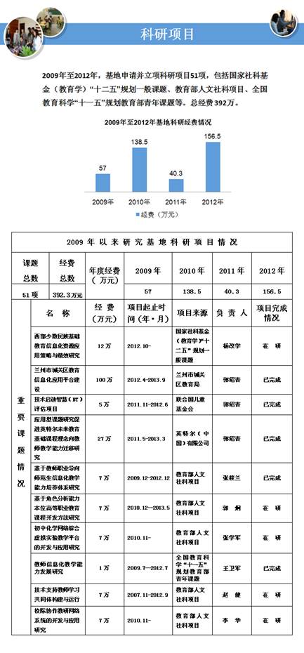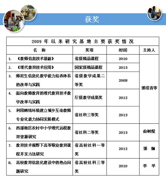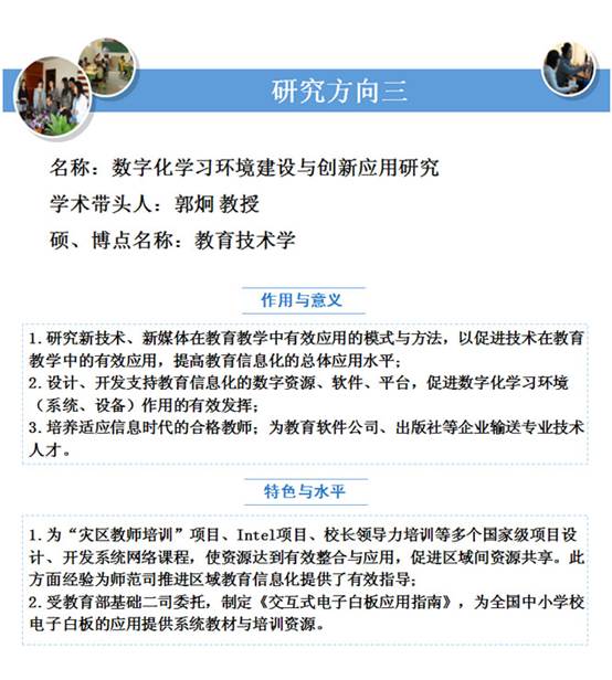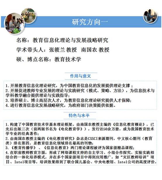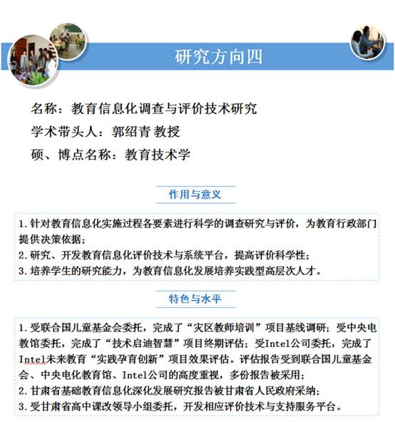 太阳成tyc7111cc教育技术学学科是全国较早建立的教育技术学学科之一,是全国8个教育技术学博士点之一,在中国教育技术学学科奠基人之一的南国农教授指导和带领下,在以郭绍青、杨改学、杨晓宏、张筱兰教授等学术带头人为首的学术团队的不懈努力下,太阳成tyc7111cc教育技术学学科一直是全国教育技术学领域的重要学术重镇,在国内外具有重大学术影响力,现为甘肃省省级重点学科。中心将以教育技术学重点学科为依托,根据教育技术学重点学科已经形成的优势和特色,加强内涵建设,明确以教育信息化理论研究为核心,以运用远程教育资源促进甘肃教育均衡发展为重点,以教育信息化评估与检测研究为突破口,以数字化学习环境建设与创新应用为理论与实践的桥梁,进一步凝练和强化四个研究方向,提升整个研究团队的规划、设计能力,真正做到在教育信息化理论与实践研究领域的国内领先水平。