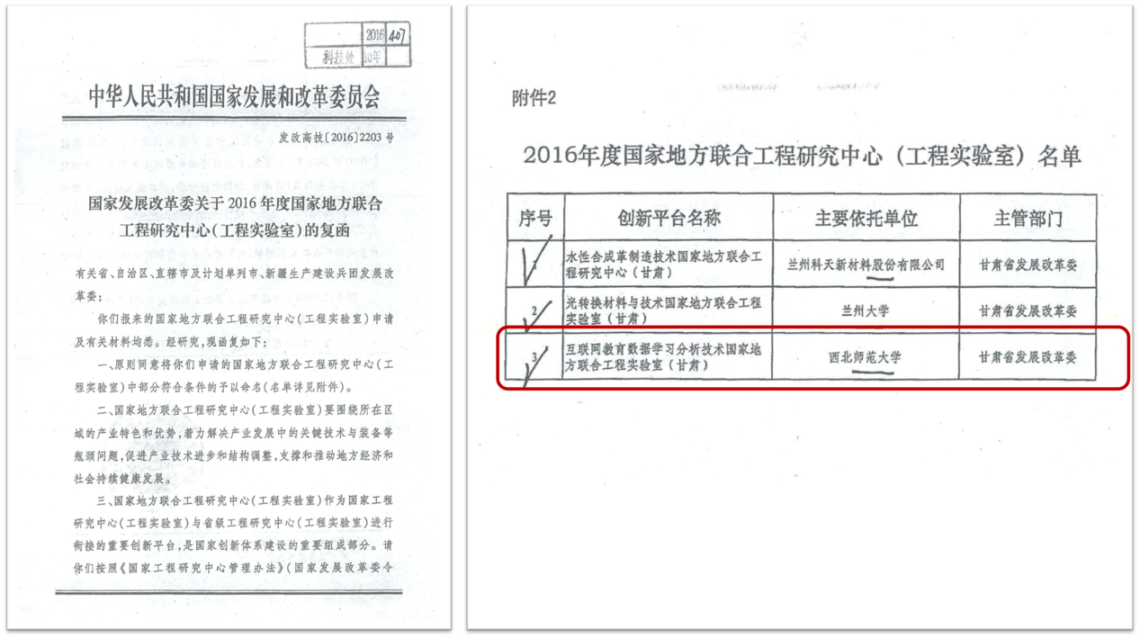 互联网教育大数据学习分析技术国家地方联合工程实验室是国家发展改革委员会于2016年批准建设的科研平台,是国内首个、甘肃唯一互联网教育领域国家地方联合工程实验室。