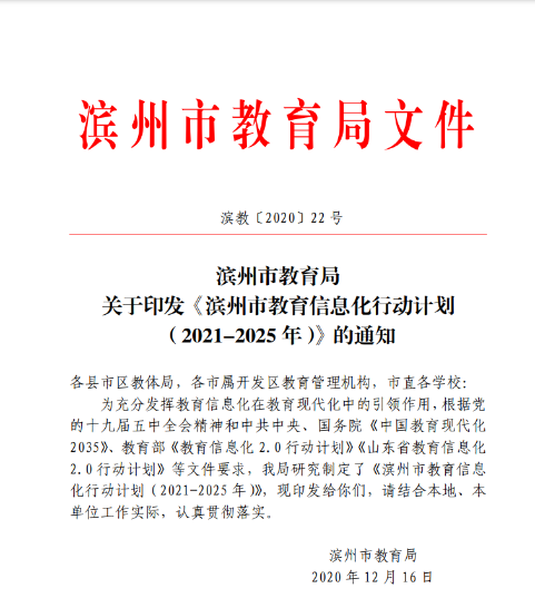 山东省滨州市教育局结合当地的教育信息化发展现状及实际需求,为全面提升教育教学质量,进一步推动滨州市教育信息化支撑和引领教育现代化,于2020年7月,邀请郭绍青教授团队负责《滨州市教育信息化行动计划(2021-2025年)》的制定。