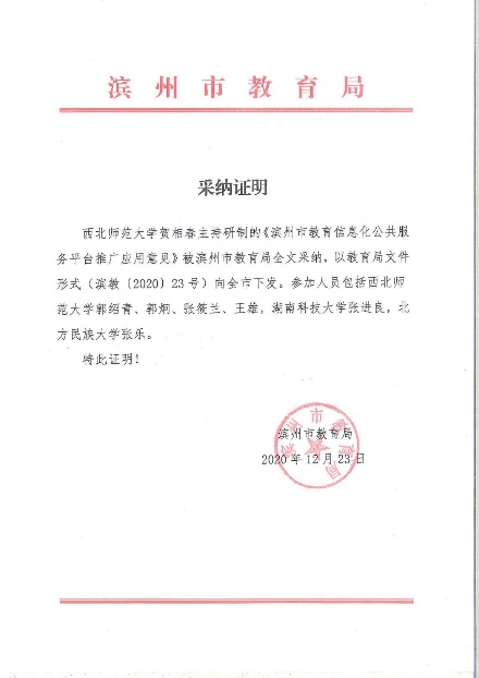 郭绍青教授团队根据《滨州市教育信息化行动计划(2021-2025年)》,在深入调研滨州市教育信息化公共服务平台建设与应用现状以及存在问题的基础上,多次与滨州市教育局、学校管理者、平台使用人员、平台建设方沟通交流,从指导思想、应用目标、主要任务、保障措施四个方面制定了《滨州市教育信息化公共服务平台推广应用意见》,该意见于2020年12月被滨州市教育局采纳,并作为教育局政策文件全文印发(滨教[2020]23号),要求滨州市教育相关部门及学校遵照执行,指导全市教育信息化公共服务平台的推广与应用。