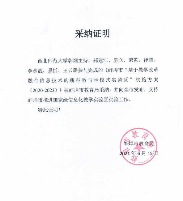 “方案”于2021年1月被蚌埠市教育局采纳,作为全市“基于教学改革融合信息技术的新型教与学模式实验区”实验工作的指导性、纲领性文件全文印发(蚌教电【2021】1号),为后期实验区各项任务有序推进、实验创新探索高质高效开展提供了目标指向与实施路径,为全市“基于教学改革融合信息技术的新型教与学模式”实验区工作开展提供了切实指导。