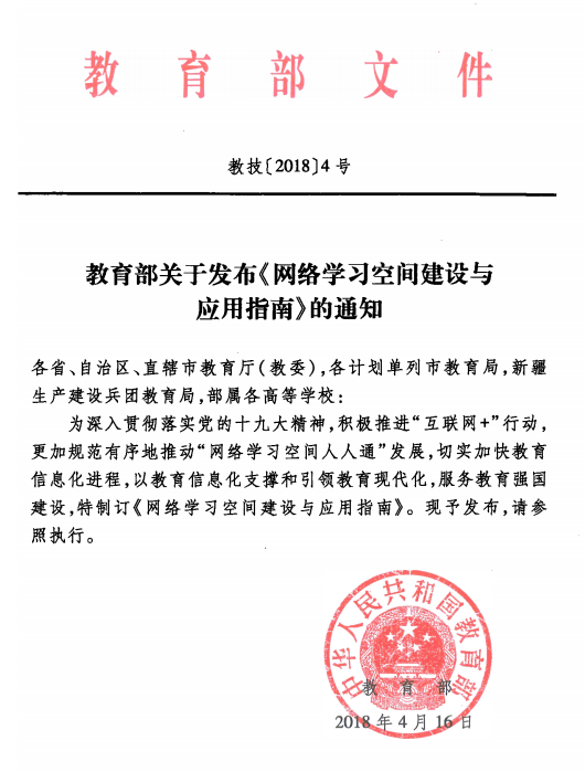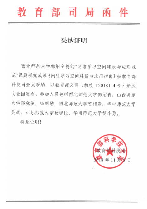 该成果于2018年4月被教育部科技司采纳,作为各级教育信息化主管部门、企业和各级学校开展空间建设与应用相关工作的指导性文件,以教育部“教技[2018]4号”文件的形式公开发布。该指南明确了空间的内涵、空间建设与应用的目标、原则及流程,提出并阐释了空间的功能框架,规定了空间安全保障的具体要求,为各级各类教育的空间建设与应用提供了合理参考,有力的推动了空间建设与应用的规范化、系统化,为建成“互联网+教育”大平台,促进教学方式与学习方式变革,创新教育服务模式与管理体制机制提供了工作指南和政策依据。