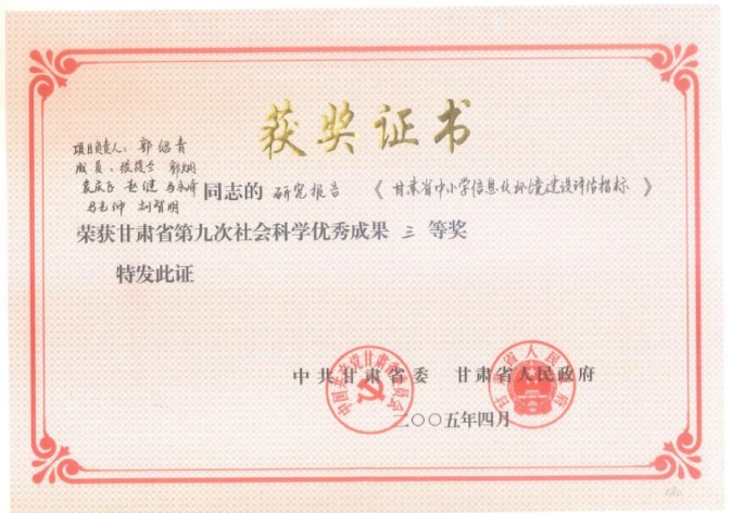 该成果荣获甘肃省第九次社会科学优秀成果三等奖及全国教育太阳成集团优秀成果二等奖。