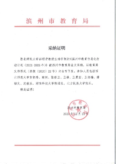 郭绍青教授团队根据党的十九届五中全会精神和中共中央、国务院《中国教育现代化2035》、教育部《教育信息化2.0行动计划》、《山东省教育信息化2.0行动计划》等文件要求,结合长期从事教育信息化相关战略与规划制定工作的经验和积累,在深入调研滨州市教育信息化发展现状和存在问题的基础上,多次与滨州市教育局、学校管理者沟通交流,从指导思想、基本原则、建设目标、重点任务、保障措施等五个方面,制定了《滨州市教育信息化行动计划(2021-2025年)》,该规划于2020年12月被滨州市教育局采纳,并作为教育局政策文件全文印发(滨教[2020]22号),要求滨州市教育相关部门及学校遵照执行,指导开展2021-2025年教育信息化的建设和发展工作。
