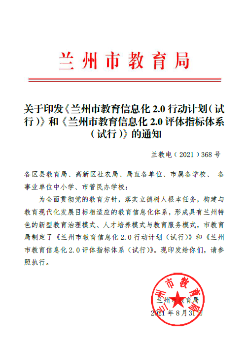 同时配套制定了兰州教育信息化2.0评估指标体系及工具,明确了市、区县、学校各层面的工作内容、评估要点及方法。“规划”的制定为后续开展全市教育信息化2.0推进工作,全面提升区域教育信息化发展水平和支撑服务能力,推动教育理念更新、模式变革、体系重构等提供了目标指向和方法支撑,助力区域智慧教育示范区建设及教育现代化发展。