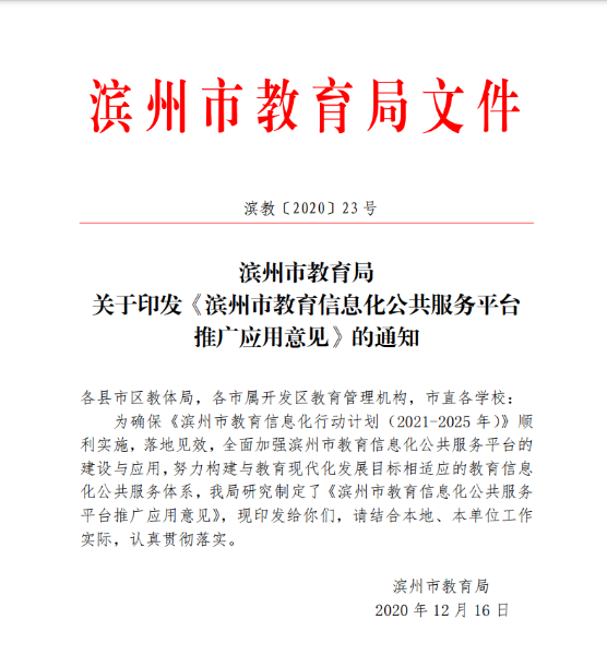 《滨州市教育信息化公共服务平台推广应用意见》,一方面,为《滨州市教育信息化行动计划(2021-2025年)》的顺利实施提供支撑保障,整体推进教育信息化的建设与发展。另一方面,助力滨州市建设高质量公共服务体系,全面促进教育资源的共建共享,支撑人才培养、教育服务、教育治理的一体化发展,发挥平台的最大效益,全面提升教育教学质量。