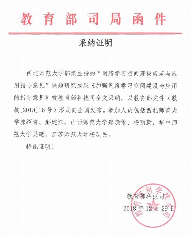 该成果于2018年12月被教育部科技司采纳,作为各级教育信息化主管部门、相关企业和学校推进空间建设与应用工作的指导性文件,以教育部“教技[2018]16号”文件的形式公开发布。该文件明确了当前推进网络学习空间建设与应用的总体目标与工作原则,提出了推进空间建设与应用的八项主要任务,并对相关保障措施给出了具体要求,为各级教育主管部门、各级各类学校明确工作职责与方向,合理制定工作规划,切实推进空间建设与应用,发挥空间效能提供了指导与依据。