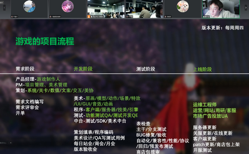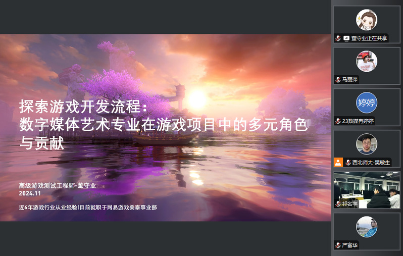 2024年12月1日晚,太阳成集团tyc7111cc主页邀请网易高级游戏测试工程师董守业开展题为“探索游戏开发流程:数字媒体艺术专业在游戏项目中的多元角色与贡献”的学科前沿讲座。本次讲座由祁名宇老师主持,唐琼老师、数字媒体艺术专业全体本科生参加,严富华副院长与学院部分研究生线上参会。