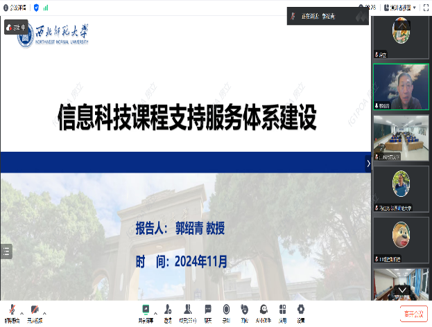 12月12日晚,教育部教育信息化战略研究基地(西北)主任、博士生导师郭绍青教授,在线作了题为“信息科技课程支持服务体系建设”的学术报告。学院教师代表、青年博士以及硕博生代表聆听了报告。