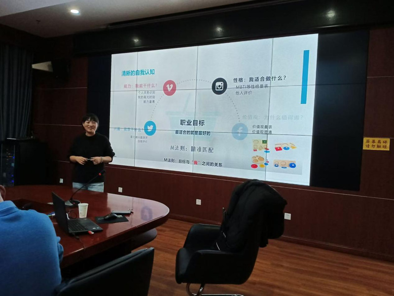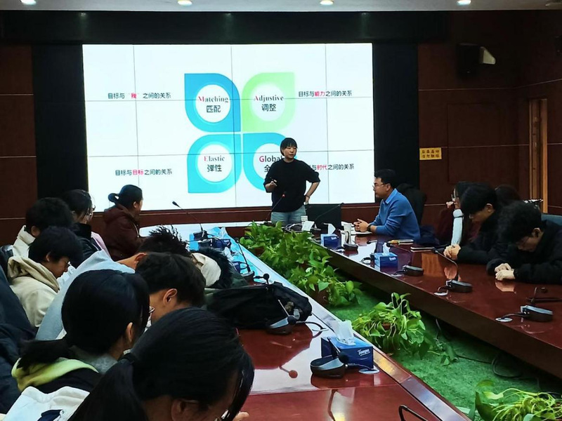 余蓉主任将讲座分为三个部分:职业目标的设定、学习与实践行动以及规划的动态调整。在讲述过程中,她特别强调了确立清晰职业目标的重要性,并为此提出了四大指导法则。这四条法则分别从个人兴趣与能力、专业背景、具体目标设定以及时代趋势等角度出发,深入探讨了它们之间相互影响的关系。余老师指出,最适合自己的才是最好的选择,鼓励大家在追求梦想的同时保持灵活性,既要考虑到目标实现的可能性,也要紧跟时代步伐,全面审视自身所处的环境,从而制定出最优化的职业发展路径。在整个讲座过程中,余老师还与在场同学进行了积极互动交流,不仅分享了许多宝贵的经验之谈,更是以“抬头望星,低头走路”这句富有哲理的话语作为寄语送给每一位参与者,激励大家既要有远大的理想和抱负,也要脚踏实地地去奋斗。
