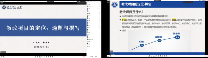 杜艳秋以“教改项目的定位、选题与撰写”为主题,从教改项目的概念、作用、与科研项目的异同、选题思路、申报书撰写要点和注意事项方面作了详细讲解。她提出,教改项目在提高教学质量和推动人才培养能力方面具有重要意义。结合具体案例,她深入解析教改项目与科研项目的差异,强调教改研究需紧扣“教学真问题、育人新需求、改革实效性”三大维度。针对申报书撰写,从“问题导向的选题切口”“证据链支撑的研究设计”“可视化成果的培育路径”三个层面展开剖析,特别要避免“重理论轻实践”“成果路径模糊”“特色凝练不足”等问题。她建议要从实际教学出发,关注教学改革热点、难点问题,申报具有创新性和实践价值的研究课题。
