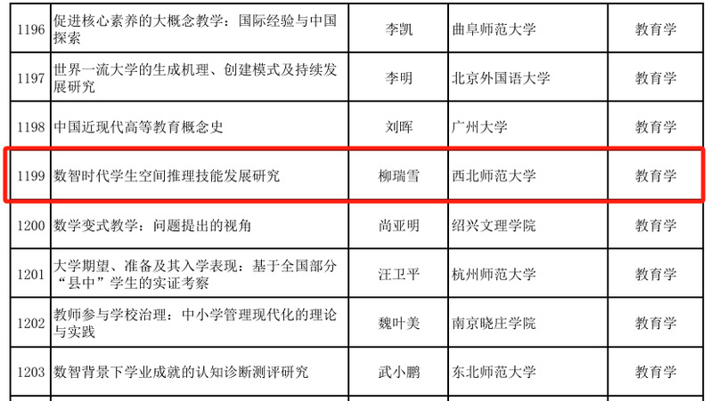 近日,全国哲学社会科学工作办公室公布了2024年国家社会科学基金后期资助暨优秀博士学位论文出版、优秀学术著作再版项目立项名单。学院柳瑞雪副教授申报的“数智时代学生空间推理技能发展研究”获批立项。