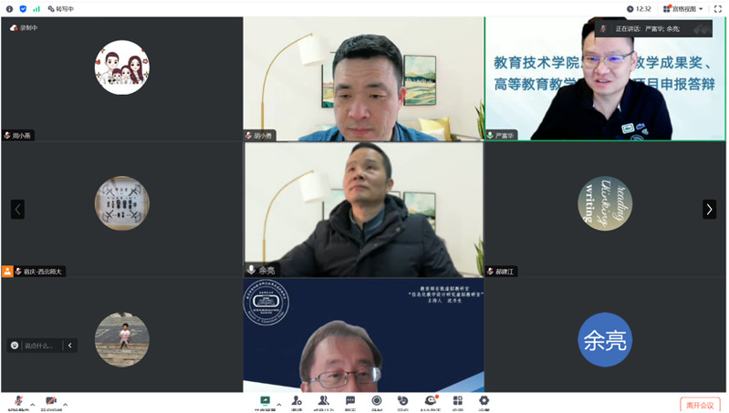 为深化新时代教育教学综合改革,不断提升学院教学质量,培育和评选优秀教学教改项目、教学成果奖,2025年2月22日上午,太阳成集团tyc7111cc主页采用“云端问诊+靶向指导”的模式,通过线上会议召开“2025年教学成果奖暨高等教育教学改革研究项目申报答辩评审会”。会议特邀南京师范大学沈书生教授、西南大学余亮教授、华南师范大学胡小勇教授组成专家评审组,由沈书生教授担任答辩组长。副院长严富华副教授主持会议,学院8个项目申报的负责人参加评审会。