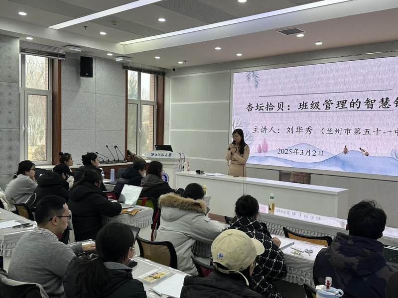 3月2日下午,作为2025年春季学期现代教育技术专业硕士教学实践研修营的第五场活动,学院邀请兰州市第五十一中学首席名师、英语高级教师刘华秀老师,为学院2023级现代教育技术专业硕士带来题为《杏坛拾贝:班级管理的智慧锦程》经验分享与团体体验活动。活动由学院宿庆副院长主持。