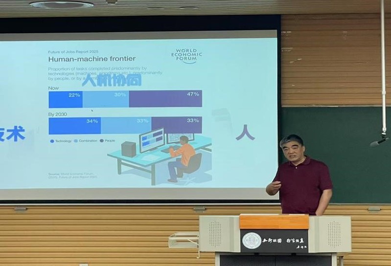 讲座中,焦建利教授还分享了,2030年在人机协同工作中技术与人力的任务分配情况,得出“技术占比将大幅增加、人力占比将相对应减少”的结论。他呼吁教育工作者应主动适应人工智能时代,通过“双向奔赴”的协作模式,提升专业素养与技术创新能力。