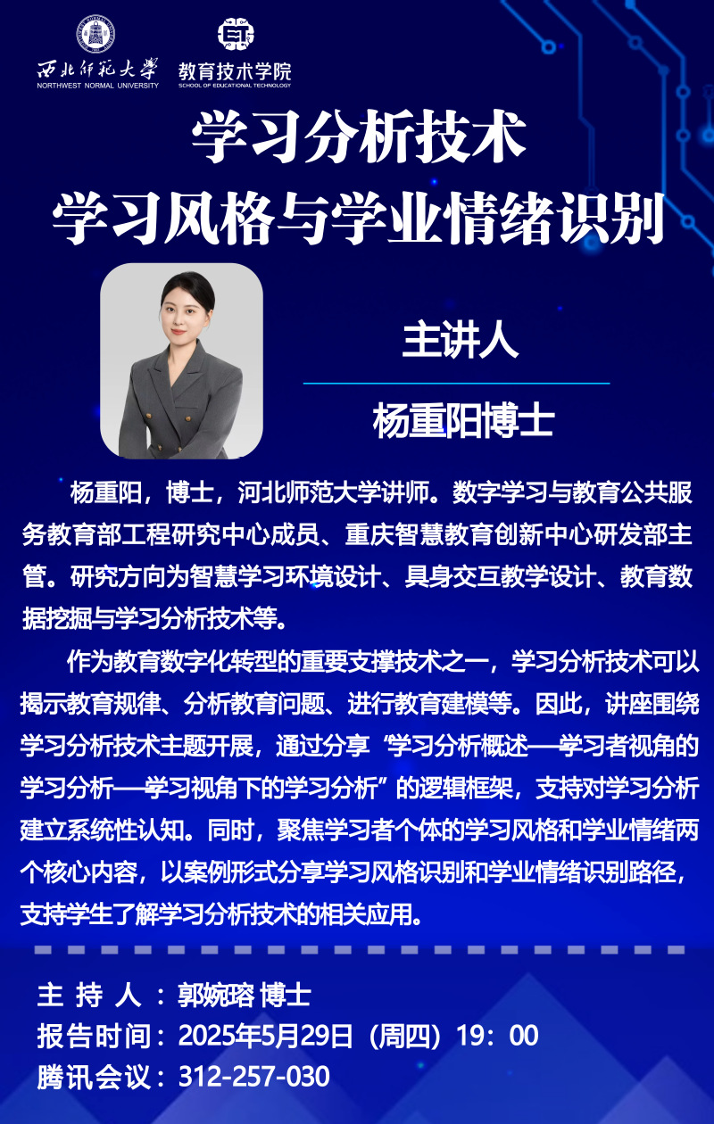 杨重阳,博士,河北师范大学讲师。数字学习与教育公共服务教育部工程研究中心成员、重庆智慧教育创新中心研发部主管。研究方向为智慧学习环境设计、具身交互教学设计、教育数据挖掘与学习分析技术等。截至目前,主持科研项目2项,在国内外学术期刊及会议累计发表学术论文18篇,参与《中国教育技术学》、《学习分析技术》、《面向网络行为的情感识别关键技术研究》等专著、编著工作。
