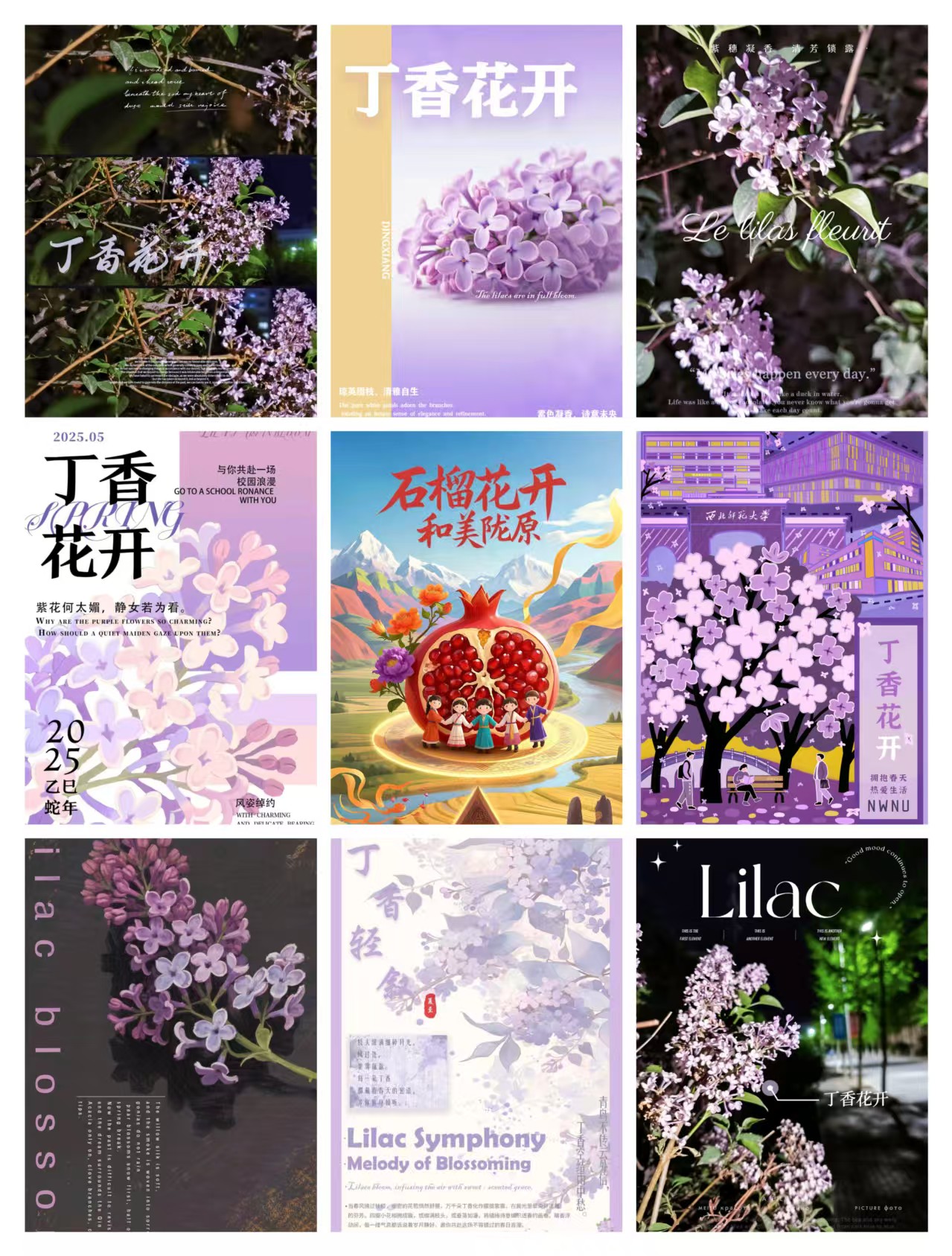 此次活动紧扣校园文化和民族团结进步主题,面向学院全体学生征集摄影摄像制作、海报设计、网页设计等创意作品。在摄影摄像领域,同学们用镜头定格丁香花的清雅姿态,展现其独特文化内涵;海报设计作品中,创作者们巧妙运用象征元素,将丁香花的柔美与石榴花的热烈融入设计,以强烈视觉冲击力传递主题;或聚焦陇原大地各民族交往交流交融的温馨瞬间,诠释“像石榴籽一样紧紧抱在一起”的团结精神。网页设计则在交互与体验中,营造出沉浸式的文化氛围。