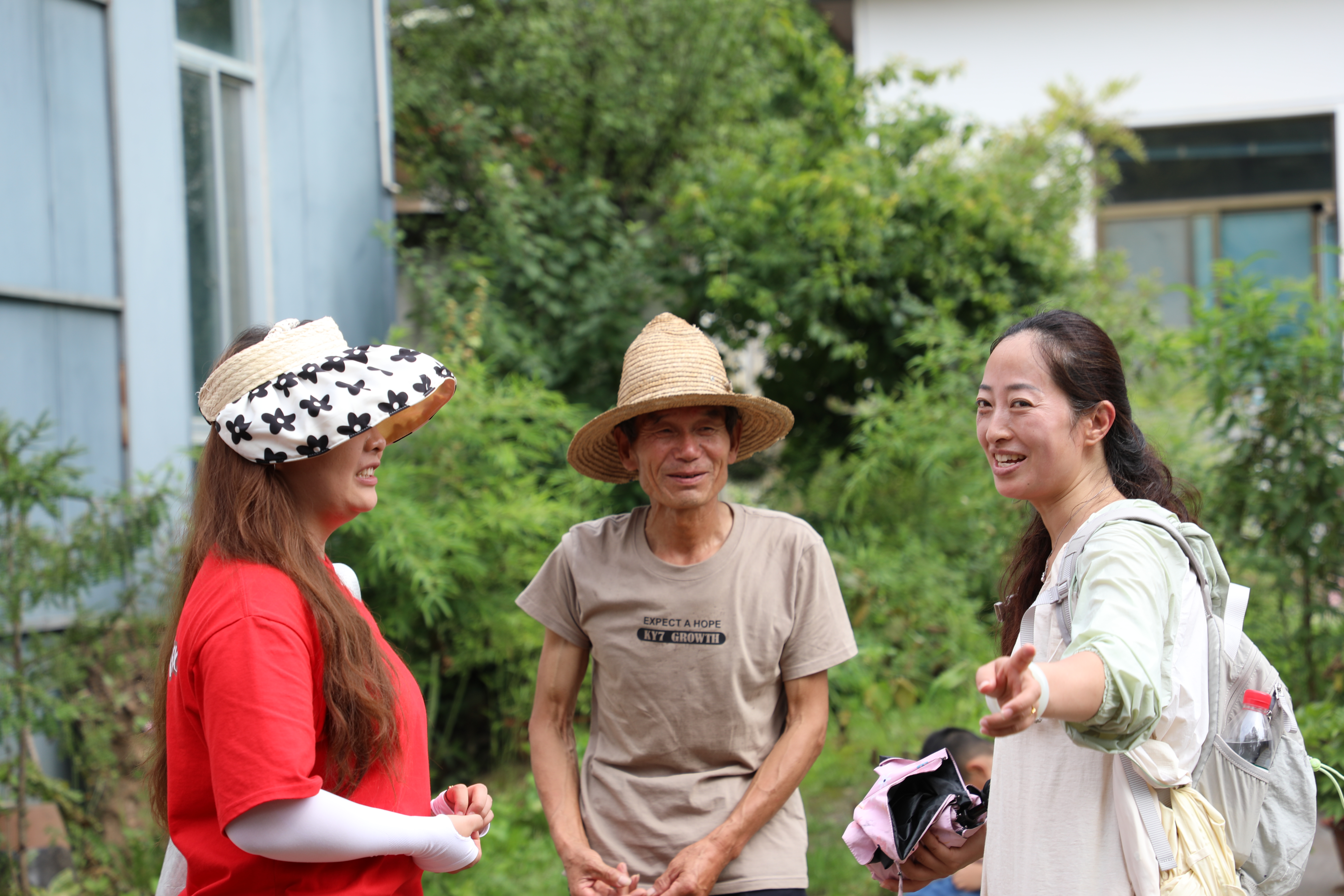 图4:实践团带队老师周小燕(右)与马山村村委书记(左)及农户(中)进行采访交流