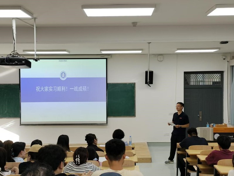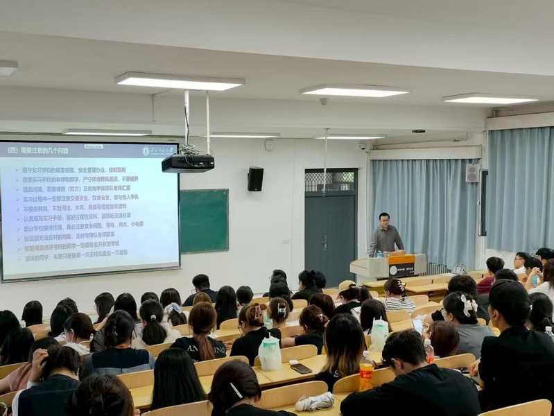 大会第一阶段,严富华作实习动员讲话。他指出,实习既是理论与实操深度融合的过程,也是校园到社会平滑过渡的关键衔接,强调师生需严守安全规范,以严谨态度、扎实专业功底与专业精神完成实习任务,实现知识到实践的转化,并勉励学生在实践中增长才干、提升能力。随后,系主任张靖细致解读本科生实习要求,围绕实习安全教育、请假规定及管理要求展开说明,特别强调学生需严格遵守实习单位与学校规章,保质完成实习教学计划、认真填写实习手册,服从指导老师及实习单位人员安排;同时明确,实习带队教师将结合学生出勤等表现进行分层次评分。