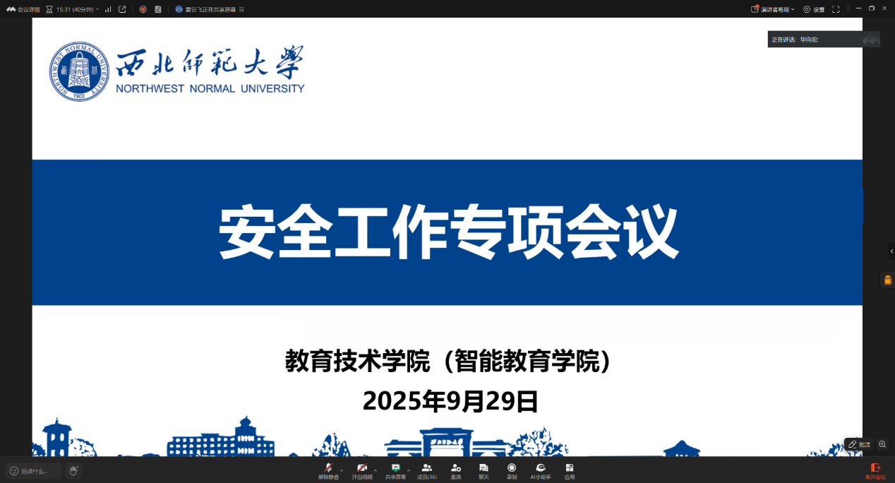 围绕假期的安全工作落实,会议进行了具体部署:要求在节前组织对实验室、办公室等重点场所进行一次全面的安全隐患排查,立查立改,堵塞安全漏洞;各班级班主任需在节前组织召开安全主题班会,研究生导师需召开安全专题组会,确保将学校及学院的安全要求传达到每一位学生,提升学生的安全防范意识和能力;关注学生动态,特别关注特殊学生群体,通过线上线下多种方式给予关心慰问,及时掌握学生动态,提供必要支持;节后对学生宿舍进行走访,排查住宿区域的安全隐患,确保学生生活环境安全稳定。