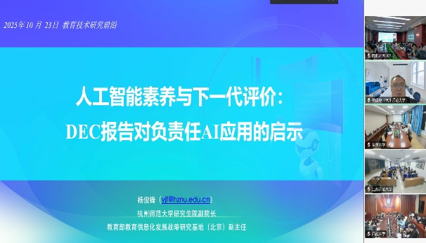 2025年10月23日晚,学院邀请杭州师范大学杨俊锋教授在线做题为“人工智能素养与下一代评价:DEC报告对负责任AI应用的启示”的学术报告。我院教师、硕博士研究生参与并认真聆听了此次报告。