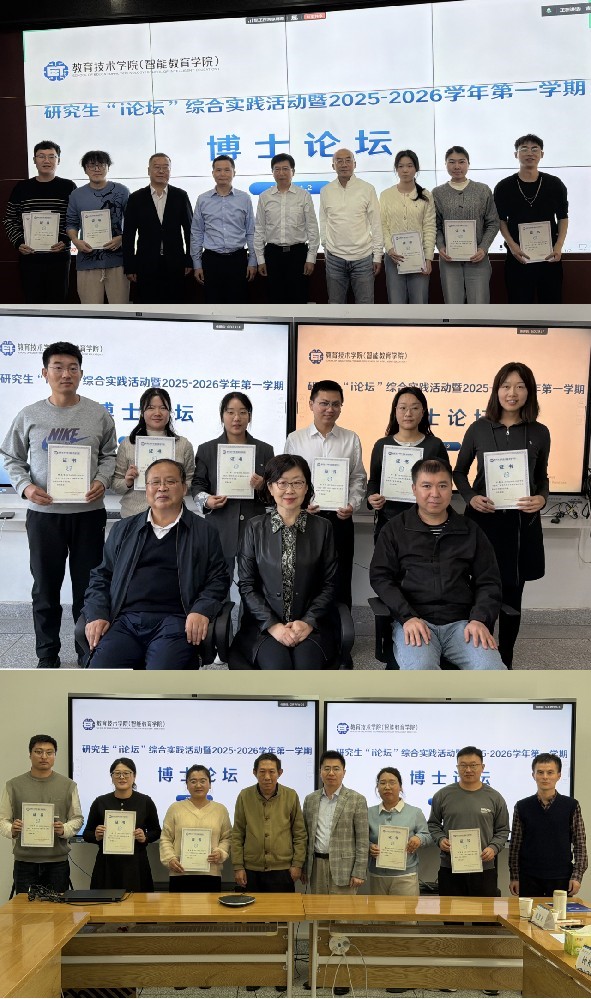 为营造浓厚的学术氛围,促进研究生之间的学术交流与思想碰撞,11月2日,学院举行“i论坛”研究生综合实践活动之博士论坛活动。本次论坛共有来自教育技术学、智能教育、教育博士(教育领导与管理)三个专业(方向)的18位博士研究生参与。论坛邀请讯飞教育技术研究院、学院兼职教授刘邦奇教授,华南师范大学钟柏昌教授,西南大学余亮教授,新疆师范大学李海峰教授以及工学院李勇教授,学院郭绍青教授、杨晓宏教授、常咏梅教授、赵健教授、蔡旻君教授分组担任点评嘉宾。