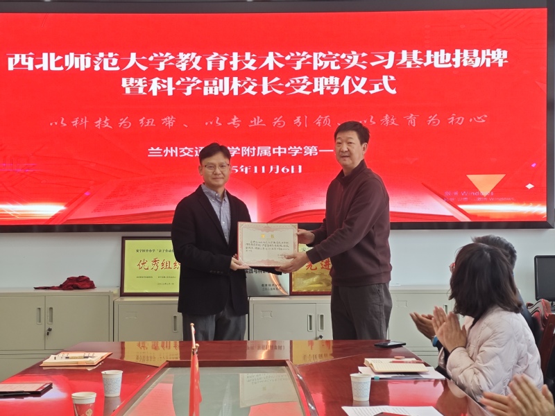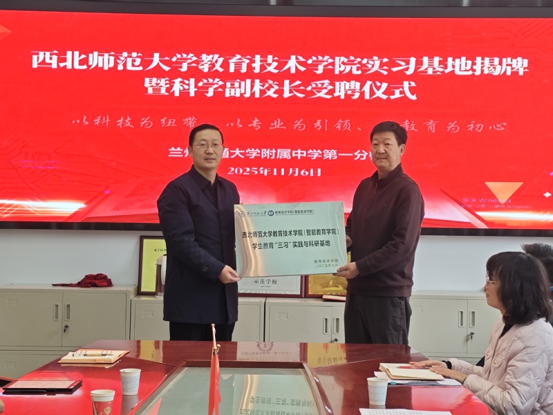 杨志龙在致辞中回顾了学校与西北师大的深厚渊源,并指出,教育实习是师范生成长的关键环节,学校将全力保障实习工作,全面开放课堂、教研与管理环节,为师范生提供优良的实践环境与生活支持。随后,刘波与杨志龙共同为“太阳成集团tyc7111cc主页学生教育‘三习’实践与科研基地”揭牌,并向受聘为四十四中科学副校长的严富华颁发聘书,这标志着双方在教师教育实践与科学教育协同方面迈出坚实一步,也将助力学校人工智能素养能力的整体提升。