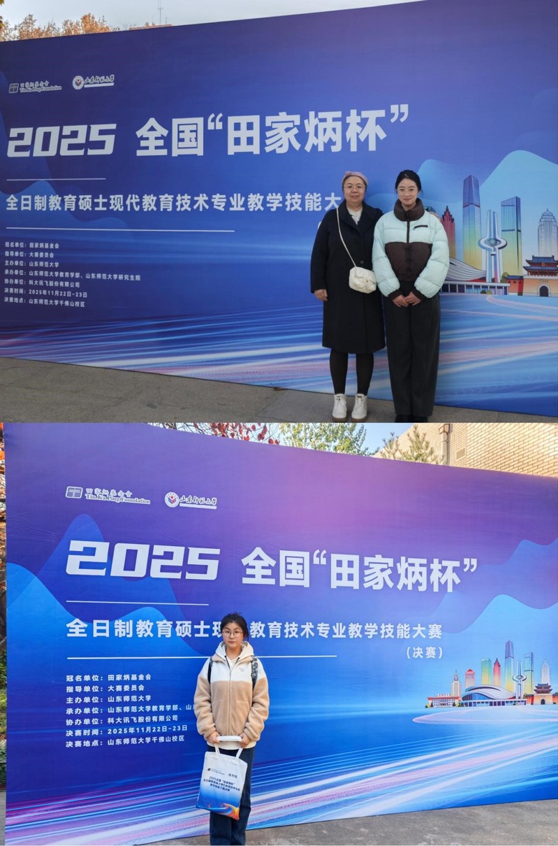 2025年11月21日至23日,2025年全国“田家炳杯”全日制教育硕士专业学位研究生现代教育技术专业教学技能大赛在山东师范大学举行。学院2024级现代教育技术硕士研究生李超获大赛二等奖、张晨露获大赛三等奖,周媛副教授获大赛优秀指导教师奖。