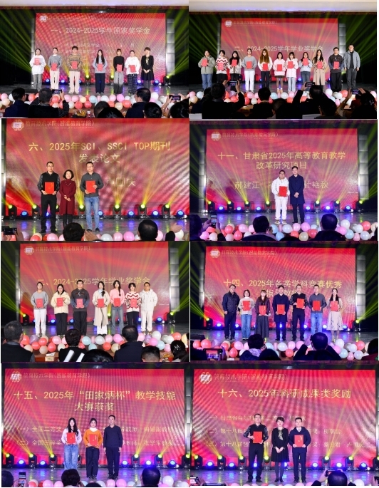 在热烈的氛围中,颁奖典礼环节如期举行。学院领导依次为2025年在国家级和省级项目立项、发表TOP期刊论文、学科竞赛等取得优异成绩的师生代表颁发荣誉证书。过去一年,学院捷报频传,不仅展现了全院师生扎实的专业素养和锐意进取的精神风貌,更彰显了学院的人才培养理念和丰硕的育人成果,为全院营造了浓厚的学术科研与创新实践氛围。